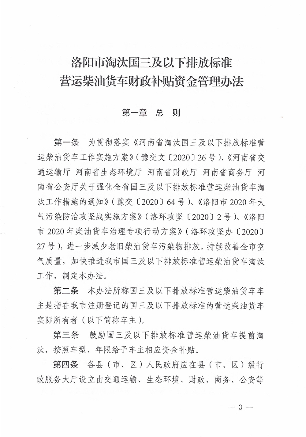 洛財建(2020)11號《洛陽市淘汰國三及以下排放標(biāo)準(zhǔn)營運柴油貨車財政補貼資金管理辦法》的通知 發(fā)布時間:2020-12-24 訪問量:2169 上一篇:沒有了 下一篇:權(quán)威!洛陽5部門印發(fā)重要文件......